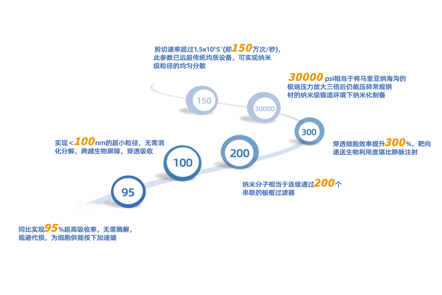 纳米乳化将营养分子处理20-200nm级粒径,显著增加比表面积,促进肠道/舌下黏膜直接吸收,生物利用度远超传统剂型,「突破吸收的物理屏障」。<30nm颗粒:穿透肠上皮细胞间隙可直入血液循环;<100nm颗粒:经淋巴系统吸收,可规避肝脏首过效应。